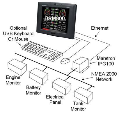 As an alternative to controlling the DSM800 through the touch screen, the DSM800 includes two USB ports for connecting keyboards, mice, or trackballs. The DSM800 also has an Ethernet port for communicating with an NMEA 2000® network (see Figure 1) through Maretron’s Internet Protocol Gateway (IPG100). Alternatively, the DSM800 can network through Ethernet to a PC running N2KServer®. Although the DSM800 comes pre-installed with the N2KView® software, a separately purchased N2KView® hardware license key plugged into the IPG100 (or PC) is required (see IPG100 User’s Manual for more details). The Ethernet port is also used for connecting Internet Protocol (IP) cameras for viewing within the N2KView® software.