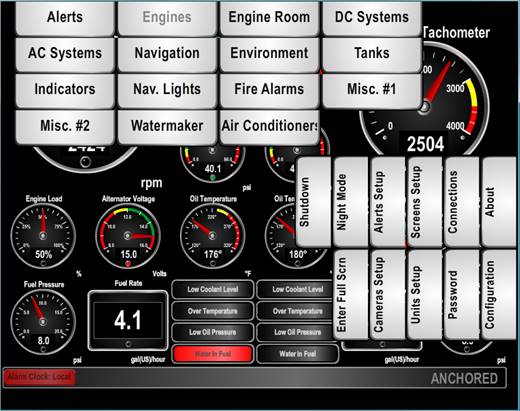 The DSM800 is a dedicated touch screen that comes preloaded with Maretron’s N2KView® vessel monitoring and control software (N2KView® hardware license key sold separately). The N2KView® software allows you to configure as many favorite screens as you want with exactly the information you want to see. Although not suitable for outdoor applications, the DSM800 provides an extremely simple touch interface for monitoring and controlling critical systems from inside the vessel.