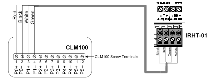 4. Connect the white and green wires from one end of the cable to the humidity channel of the IRHT-01, which is labeled “RH”, and connect the white and green wires at the other end of the cable to an unused CLM100 current loop channel. In both cases, ensure that the white wire is connected to the positive (+) terminal of the channel, and the green wire is connected to the negative (-) terminal of the channel. The example in Figure 1 shows the humidity channel of the IRHT-01 connected to CLM100 channel 1 with the white wire connected to “P1+”, and the green wire connected to “P1-”.