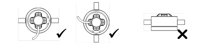 2. The fuel flow sensor contains shafts on which the oval rotors spin. The fuel flow sensor must be mounted so that these rotor shafts are always in a horizontal plane (parallel with the ground or water surface). The rotor shafts are parallel to the screws attaching the sensor cap to the sensor base, so ensure that these screws are in a horizontal plane. Please refer to Figure 1 below for examples of correct and incorrect orientations.