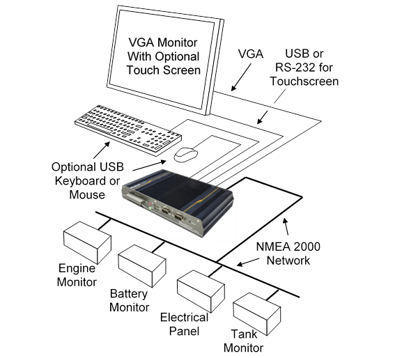 The MBB200C connects to a monitor through a VGA connector and associated touch screen through a USB or serial port connection. Alternatives to controlling the N2KView® software through a touch screen include keyboards, mice, or track balls connected through USB. In addition to the two completely isolated CAN bus connectors (M12) for easy connection to single or redundant NMEA 2000® networks, the MBB200C has an Ethernet port for connecting Internet Protocol (IP) cameras for viewing within the N2KView® software.