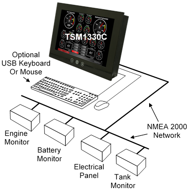 · The TSM1330C includes two CAN interfaces for direct connection to one or two NMEA 2000® networks. · The TSM1330C includes all N2KView® capabilities that were formerly licensed separately in the TSM1330: Alerts, Control, Fuel Management, and Video. No gateways (such as the IPG100), hardware license keys, or additional software licenses are needed. · You don’t need to connect or configure LAN connections, unless you are using Video or E-mail alert actions. · N2KView® configurations are transferred to and from other N2KView® devices using a USB flash drive plugged into one of the TSM1330C’s USB ports. |