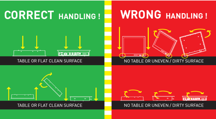 To prevent damage to chassis corners and/or breaking front glass, please review the illustrations below before handling the TSM1330C.