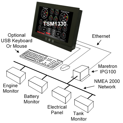 As an alternative to controlling the TSM1330 through the touch screen, the TSM1330 includes two USB ports for connecting keyboards, mice, or trackballs. The TSM1330 also has an Ethernet port for communicating with an NMEA 2000® network through Maretron’s Internet Protocol Gateway (IPG100). Although the TSM1330 comes pre-installed with the N2KView® software, a separately purchased license plugged into the IPG100 is required (see IPG100 page for more details). The Ethernet port is also used for connecting Internet Protocol (IP) cameras for viewing within the N2KView® software.