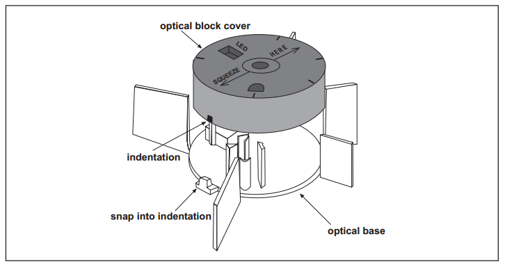 This series of self-diagnostic smoke detectors is designed for easy field service and maintenance. Figure 1 shows disassembly of the sensors protective cover. Once removed, inspect the cover for any dust build up and use air duster to clean, avoid using solvents or liquids.